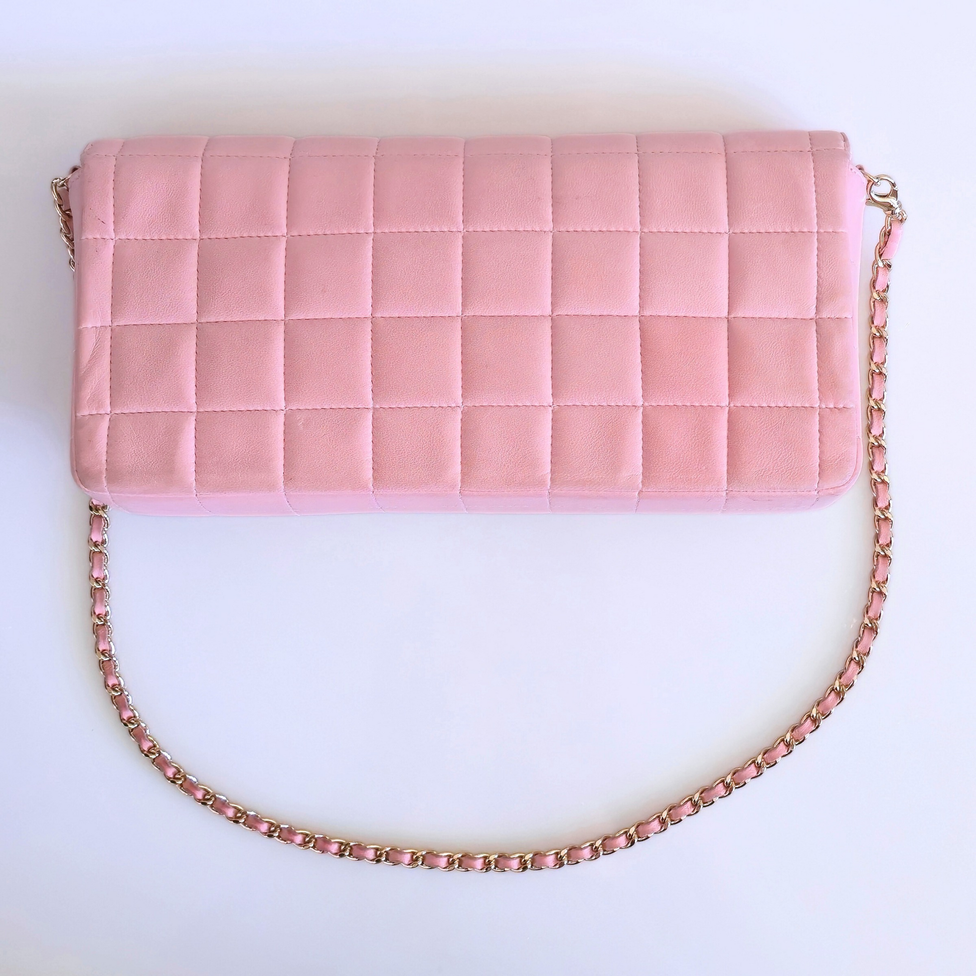 This beautiful, vintage Chanel East West Chocolate Bar Bag from 2003-2004 is a sweet find! 🍫 Crafted in a soft, ballet pink lambskin leather and with 24k plated gold hardware, this Chanel is sure to add elegance to any look. At around 10"W x 5"H x 1.5"D, it offers a spacious full leather interior with 2 open interior pockets and 1 lipstick pocket, and closes securely by a 24k gold-plated turn lock. The long, shining strap can be worn over the shoulder, or is detachable on one side and can be worn as a clutch or wristlet!