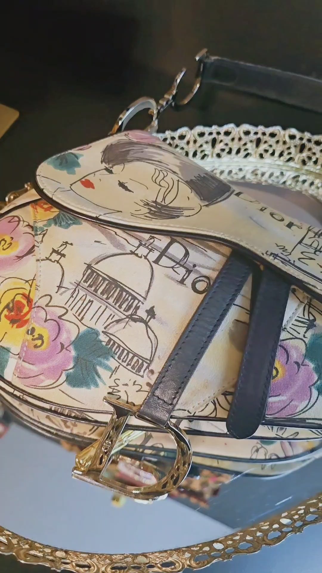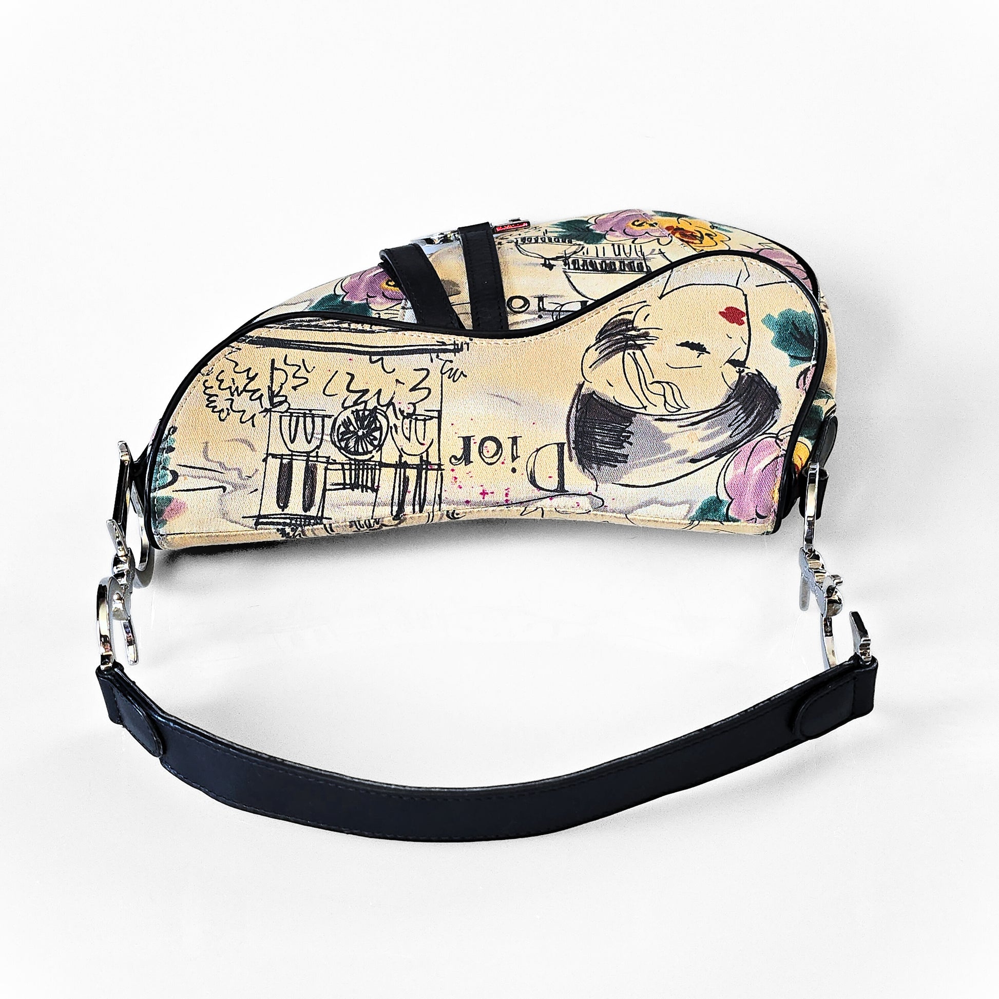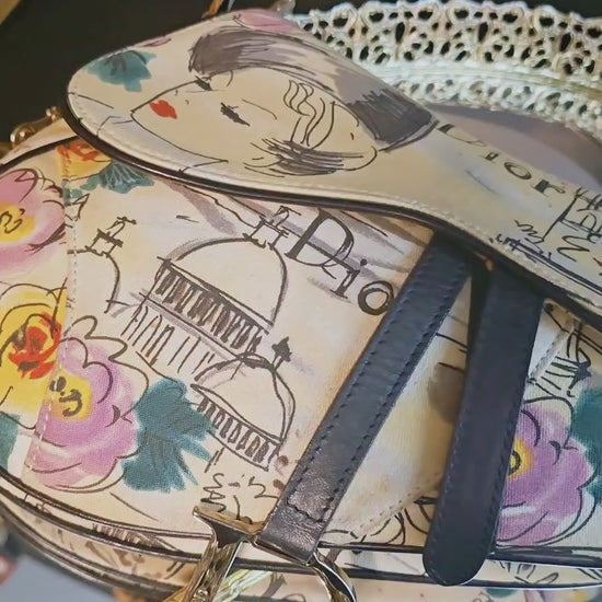This iconic, vintage, limited edition Dior saddle bag by John Galliano from 2005 will put your style right into 1950s Paris! The exterior canvas print paints a romantic parisian picture with sketches of the city, with pops of color appearing in the flowers, the lipstick of the iconic french woman, and pink splatter distressing detail.💐💄 Measuring around 10"W x 8"H x 2"D, it offers plenty of space for your everyday items on-the-go, and holds them securely with a black leather velcro strap closure that adorns Dior's iconic D charm in silver.